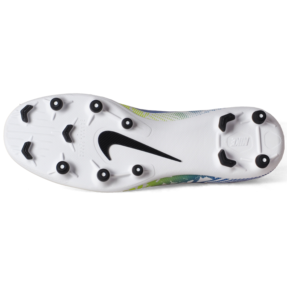 Rekreacyjne buty piłkarskie Nike dla mężczyzn do gry na naturalnej lub sztucznej murawie. Prezentowany model nawiązuje do gry Neymara i jego pasji do motoryzacji, co najbardziej oddaje charakterystyczna kratka. Korki piłkarskie Nike w biało-niebiesko-zielonej odsłonie. Konstrukcja syntetycznej cholewki z profilowaną teksturą. Podeszwa z odpowiednio rozmieszczonymi kołkami. Korki piłkarskie Nike to gwarancja wszechstronnej trakcji. Kolekcja: NJR.