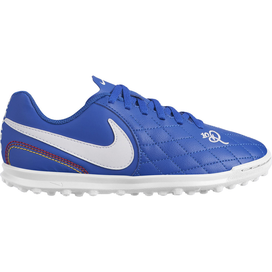 Juniorskie rekreacyjne buty piłkarskie Nike Tiempo Legend X 7 Club 10R TF. Przeznaczone są do gry na sztucznej nawierzchni zewnętrznej (turf). Kolekcja 10R, ich kolorystyka zainspirowana jest grą piłkarza – Ronaldinho oraz jego tytułem Pucharu Świata. Stworzone z miękkiej skóry syntetycznej. Posiadają pikowanie w okolicach palców, profilowaną wkładkę oraz uchwyt na języku. Podeszwa zewnętrza wykonana z gumy.