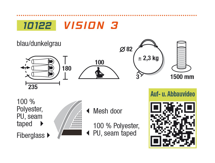 Lekki, łatwy i szybki w obsłudze namiot dla trzech osób. Duża przestrzeń użytkowa i szerokie wejście zapewniają komfort uzytkowania.
